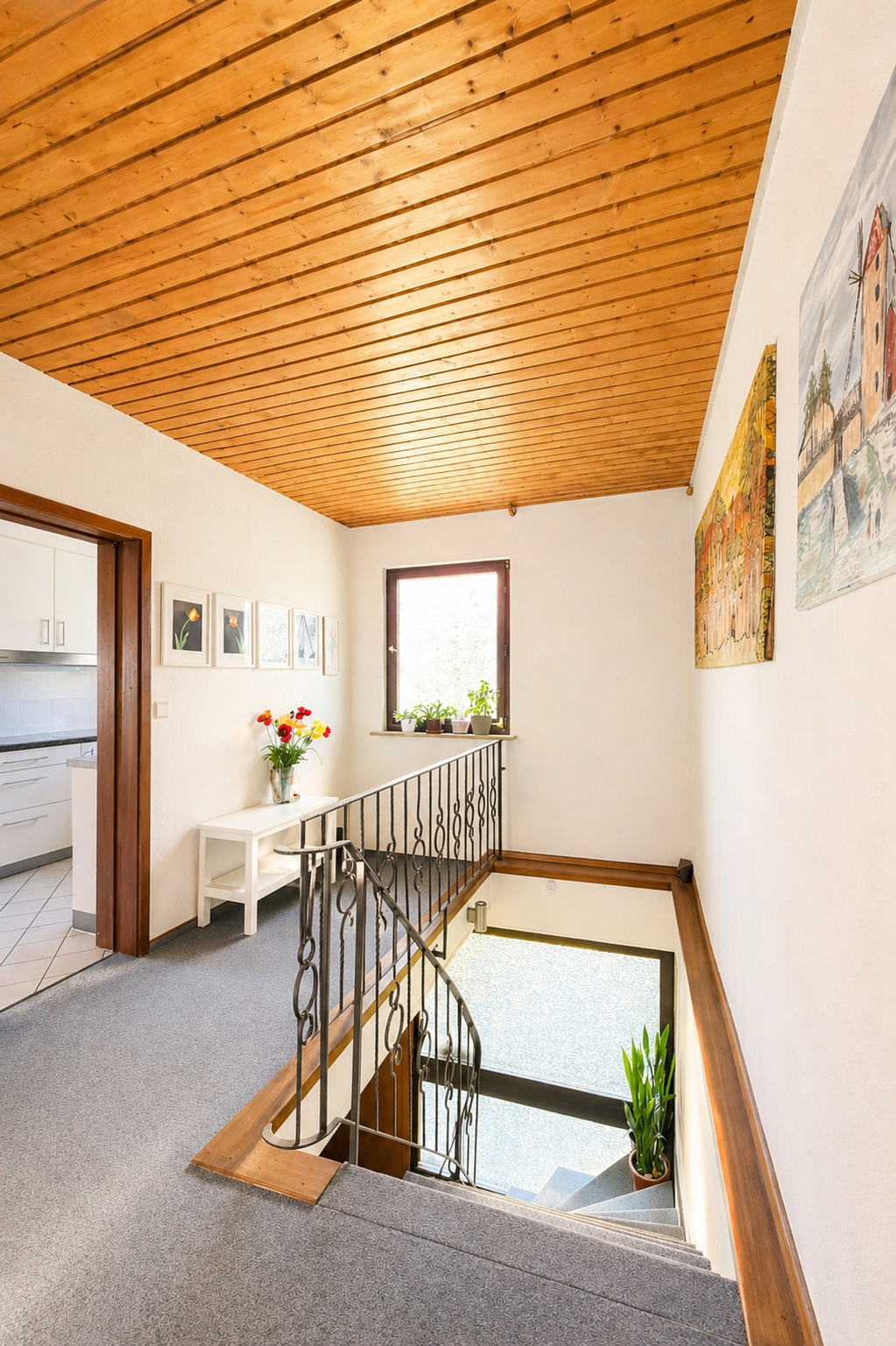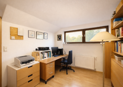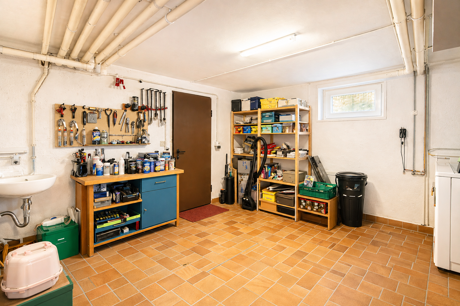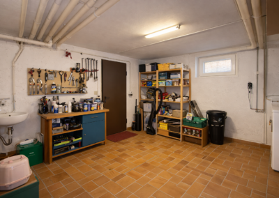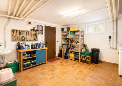 Die besondere Topografie des Grundstücks verleiht dem Haus einen eigenen Charakter. Durch die leichte Hanglage wirkt das Untergeschoss zur Straßenseite wie ein vollwertiges Erdgeschoss. Hier befindet sich neben der Garage auch ein vielseitig nutzbarer Bereich, ideal für Büro, Kinderzimmer, Gäste oder Hobby, ergänzt durch praktische Keller und Abstellräume.