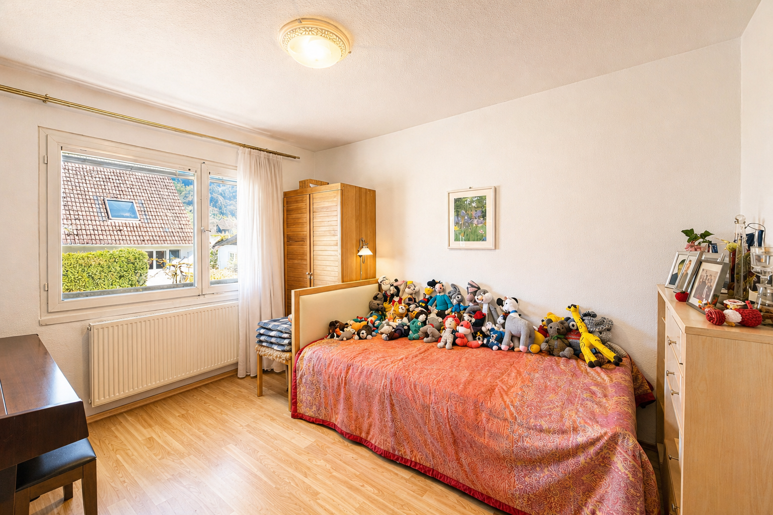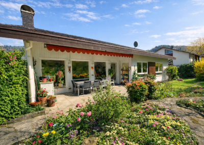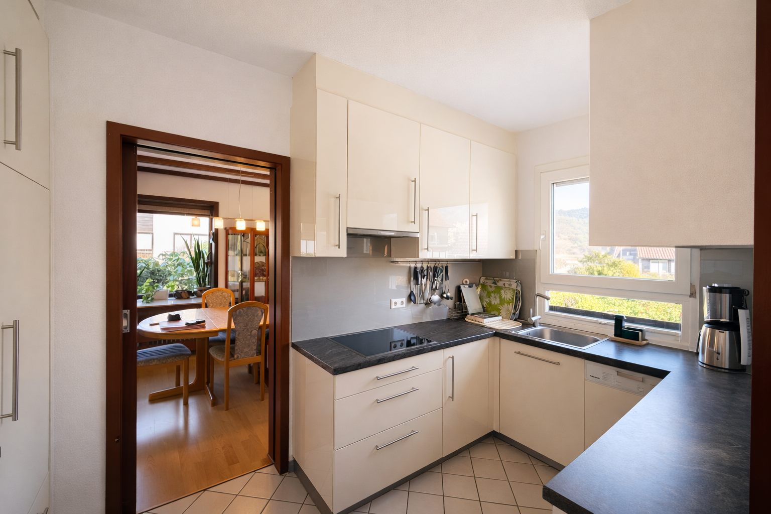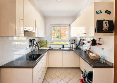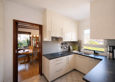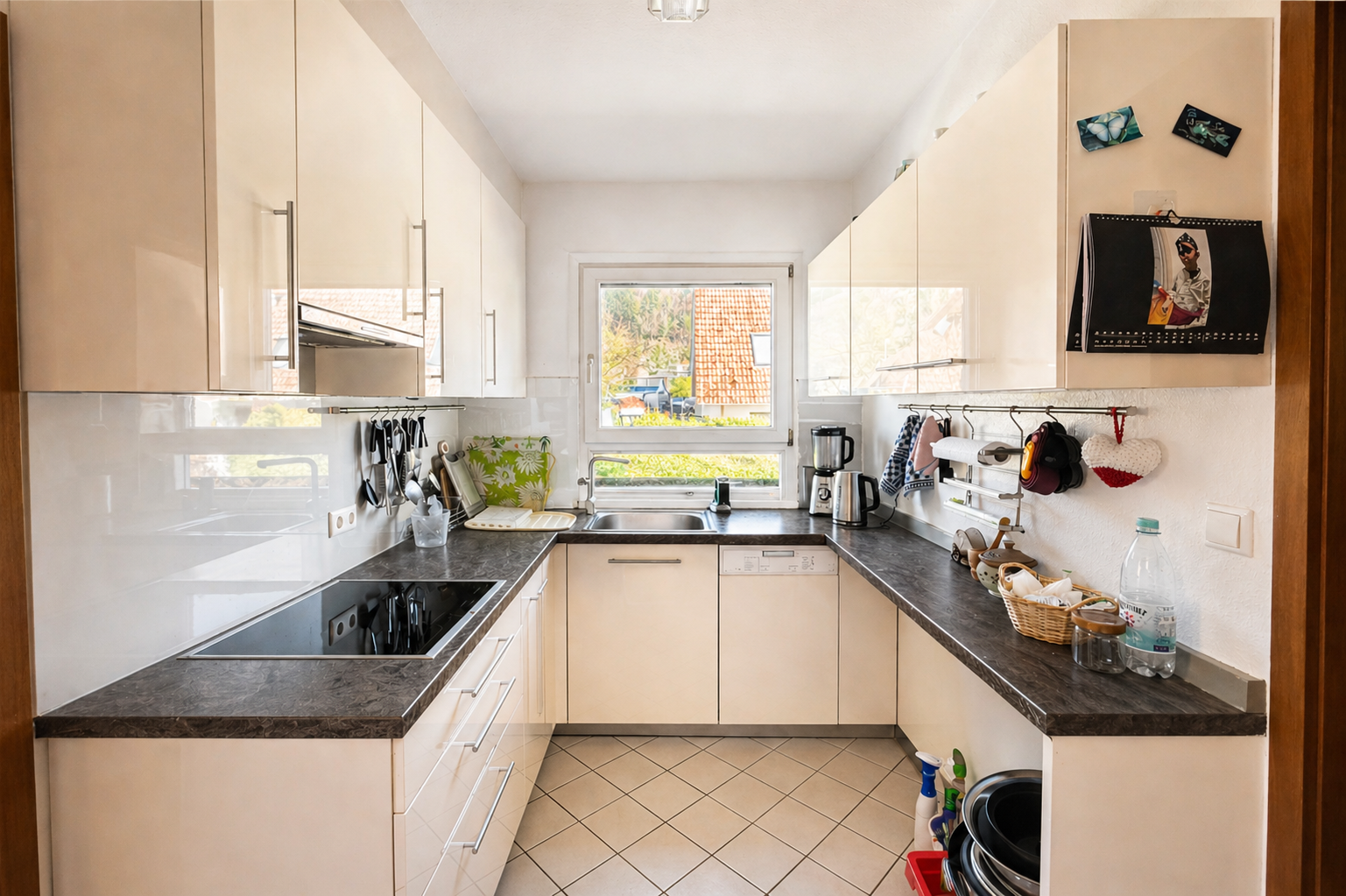 Das eigentliche Wohnen spielt sich eine Ebene darüber ab. Drei Schlafzimmer, ein modernes Badezimmer, ein zusätzliches Duschbad, die hochwertige Einbauküche von Maier Küchen sowie der großzügige Wohn und Essbereich schaffen ein angenehmes Wohngefühl. Die große Fensterfront im Wohnzimmer bringt viel Licht ins Haus und eröffnet den Blick in den wunderschön angelegten Garten. Im Sommer wird die angrenzende Sonnenterrasse fast wie selbstverständlich zum Mittelpunkt des Lebens.